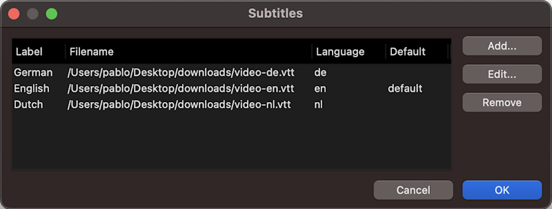 WebVTT files are plain text files with a .vtt extension and contain text along with timing information to synchronize the text with the corresponding video or audio content. Each text track within a WebVTT file is associated with a specific cue, which consists of a start time, an end time, and the text content to be displayed during that time interval. Multiple langauegs can be configured.