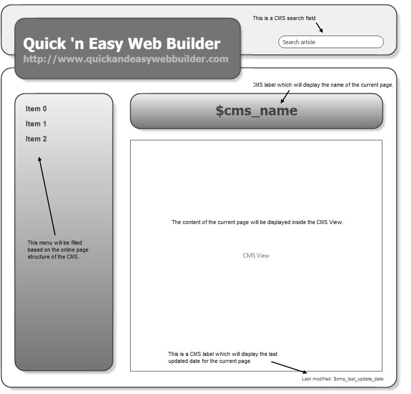 The basic idea is that the content of the page will be displayed inside a fixed area on the page, this is the CMS View. You can think of this as a frame or content place holder, although the content will be dynamically merged with the rest of the page when the page is requested from the server. Basically this means that you only need only one page for the entire website and the rest of the content is managed on the server. The layout of the page (also called the master border) can be designed with the standard Quick 'n Easy Web Builder tools. The navigation (CMS Menu) will be automatically generated based on the site structure on the server, so you don't have to fill the menus manually.