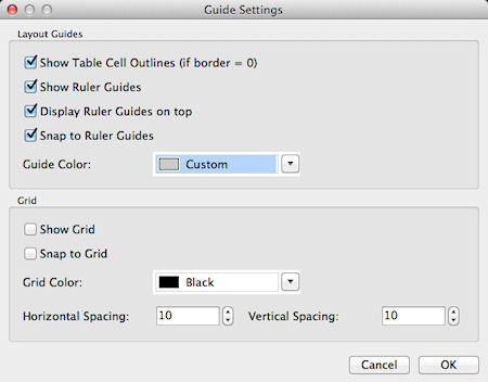 While working on a web page it can be usefull to enable guide borders, rulers and grid. To change the guide settings select Arrange->Guide Settings from the menu.