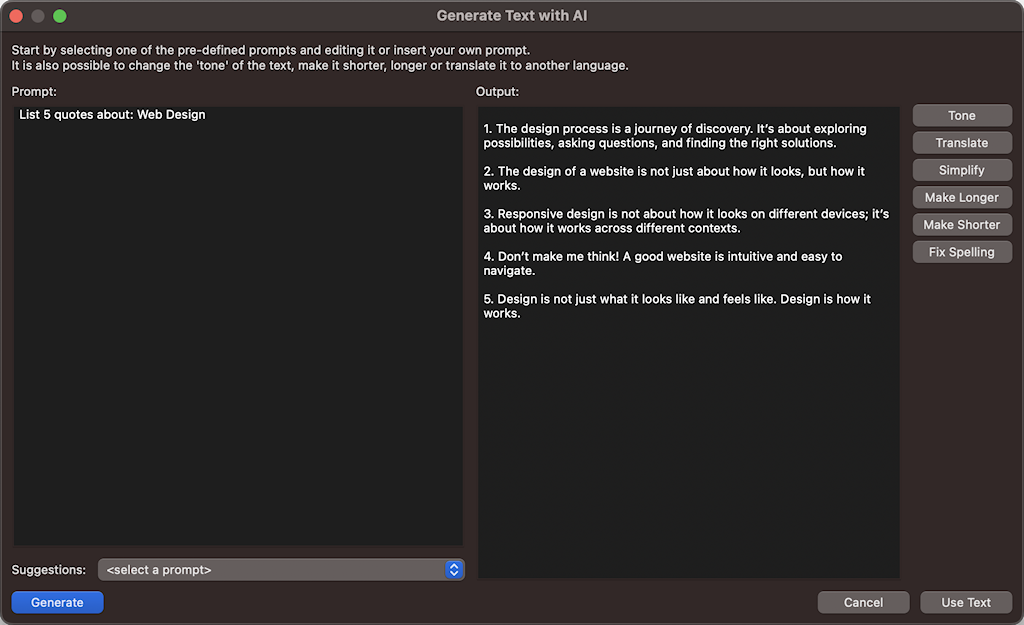 Quick 'n Easy Web Builder integrates with Ollama, allowing you to generate, translate and improve text using AI directly on your local computer. Most OpenAI-related text features introduced in version 19 are compatible with Ollama.