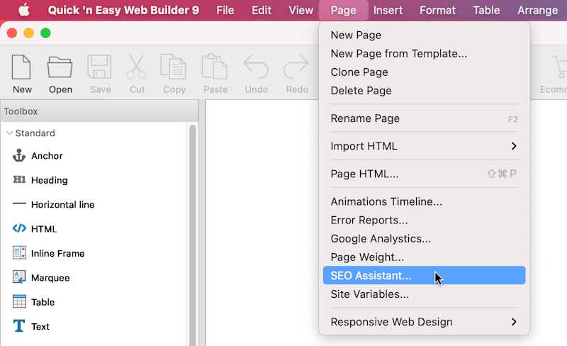 This tool helps you make your web pages more search engine friendly and improve the accessibility for users, including those with disabilities. The SEO assistant is available via the Page menu.