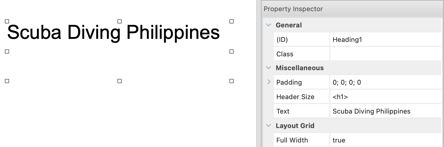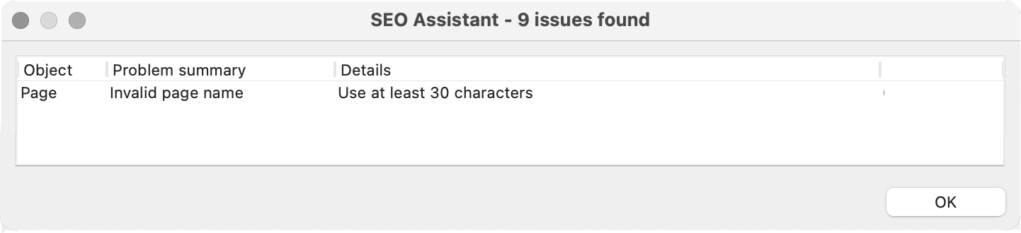 The SEO Assistant scans the page for missing image descriptions, keywords, sitemap.xml/robot.txt, header tags, broken links, mobile support and more. Double clicking one of the reported issues will either open the properties (meta tags, sitemap etc.) so you can fix the issue or select the object in the workspace.